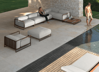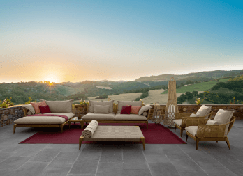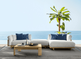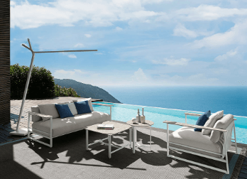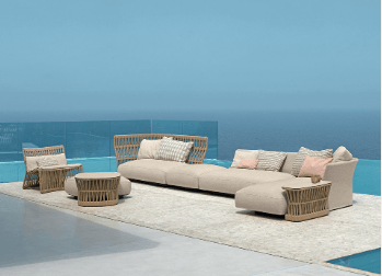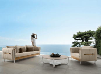 Si tratta di materiali che dialogano con l’ambiente e che possiedono delle caratteristiche di rilievo: sono più forti e resistenti ai raggi UV, più performanti di fronte agli sbalzi termici, resistono all’acqua o al fuoco. Stoffe, tessuti, alluminio, acciaio, textilene, legno, vengono plasmati e usati per diventare espressione del grande design da esterno.